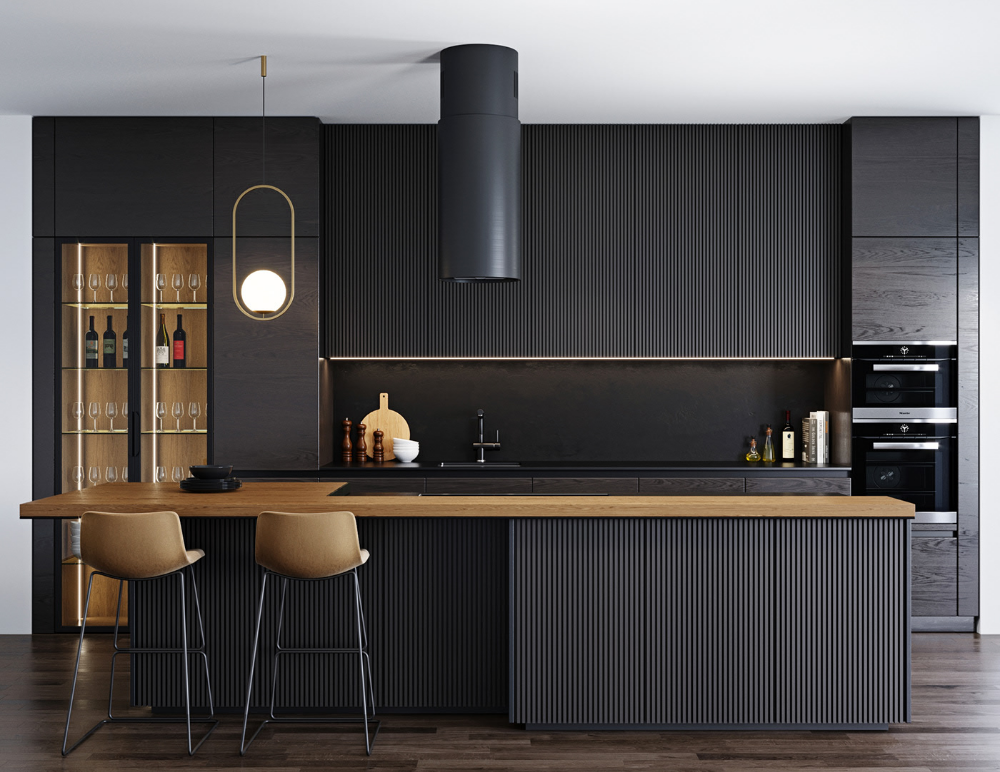 фактурную поверхность, сглаживают строгость цветовой гаммы. Темные кухни