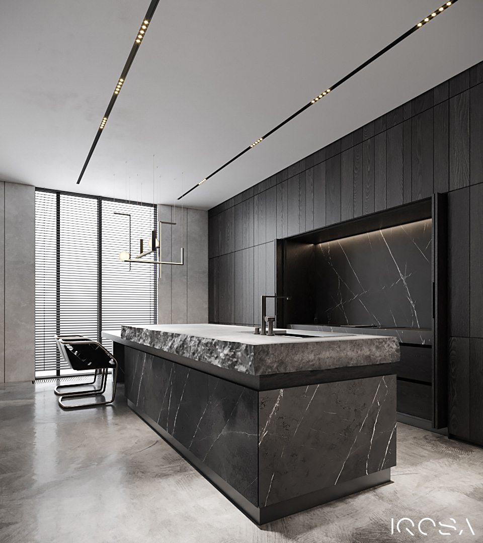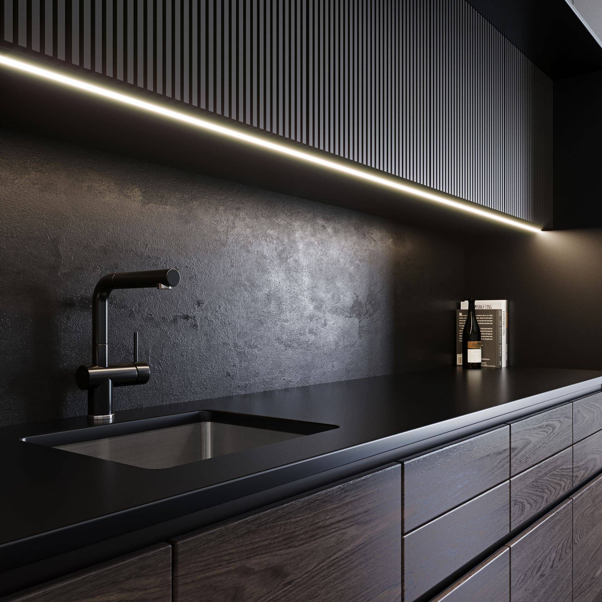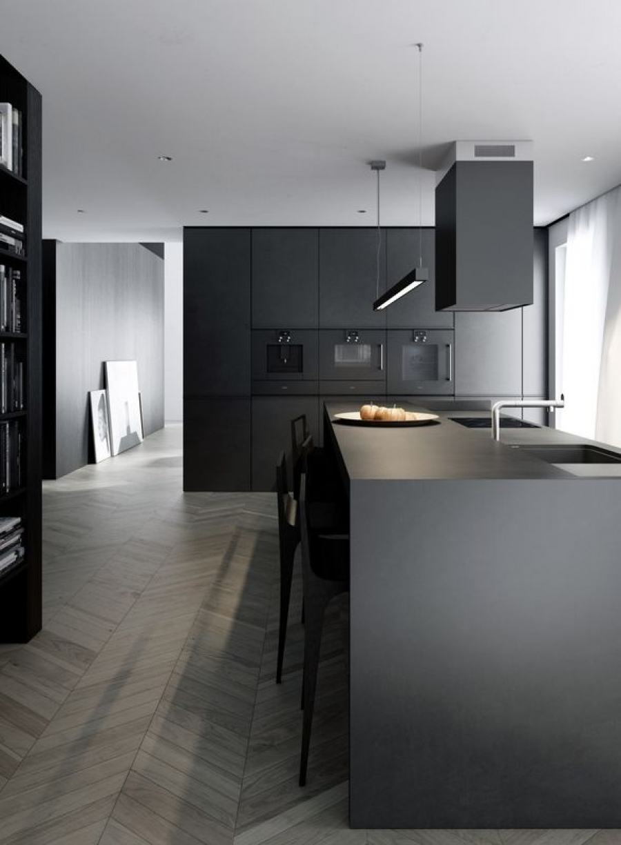 В дизайне кухни с темной мебелью помимо практичности матовых
