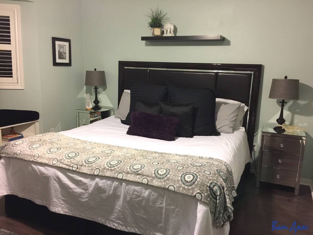 2. Цвет прикроватных тумб противопоставлен цвету изголовья. Например: кровать — черная, а тумбы — белые или кровать — светло-бежевая, а тумбы — темно-коричневые.