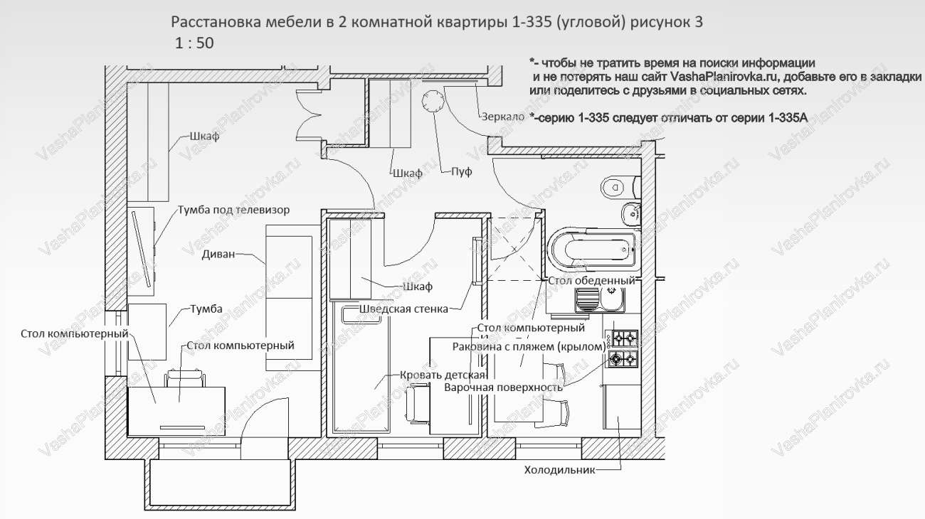 Как поставить мебель на схеме квартиры i335 можно посмотреть на чертежах ниже.