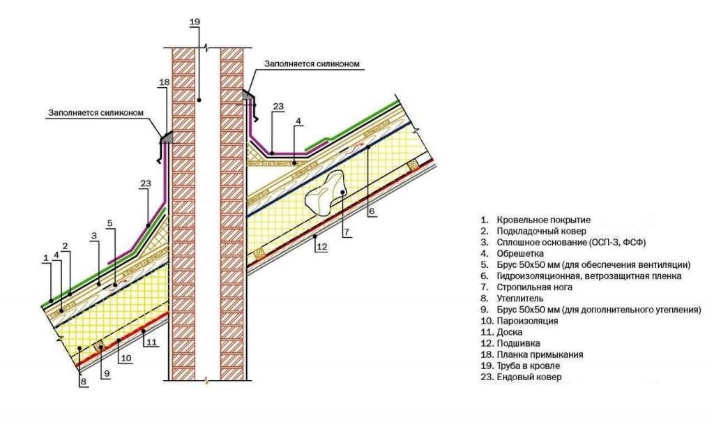 Гидроизолятор защищает слой утеплителя от действия влаги, но лишь в том случае, если слой его непрерывен. А так как большинство материалов такого рода горючи, укладывать его стык с дымоходом нельзя. Значит между трубой и кровлей необходимо оставить зазор.