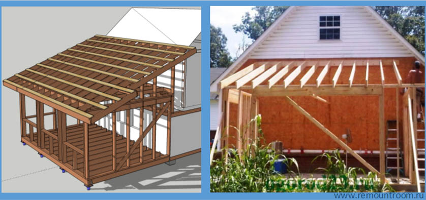 Для строительства односкатной крыши пристройки используются твердые породы дерева. Оно должно быть хорошо просушено и обработано веществами, защищающими от насекомых и воздействий атмосферы. Помимо этого, все деревянные элементы крыши лучше обработать противопожарными составами.