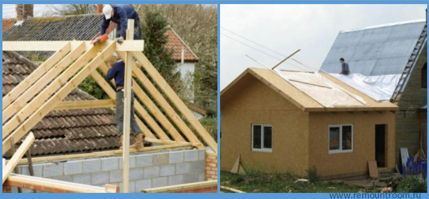 Когда размер дома увеличен, возникает вопрос кровли. Все происходит обычным способом по стандартной технологии. Примерный порядок выполнения кровли таков: