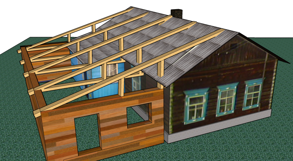 Далее – пол, потолок и другие внутренние отделочные работы. Установка проемов не составляет особенных трудностей. В случае если пристройка к деревянному дому выполнена из такого же материала, то другие детали лучше всего выполнять с применением пиломатериала.