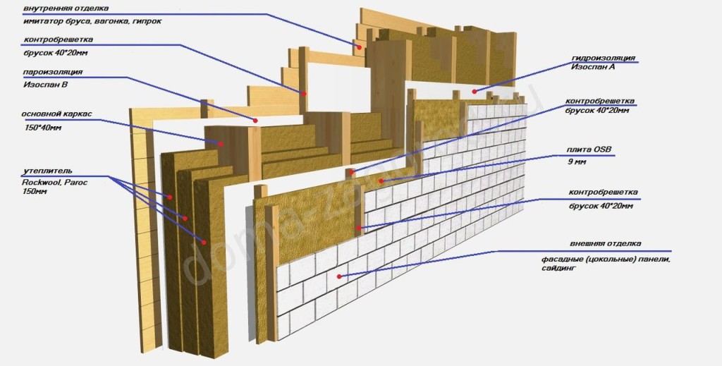 В качестве утепляющего материала для стен используют минеральную вату. Маты легко и быстро укладываются между брусками каркаса, как это видно на фотографии. При укладке утеплителя в несколько слоёв, маты смещают относительно друг друга, чтобы исключить теплопотери через стыковочные швы. Утеплитель с двух сторон закрывают паро- и ветроизоляционным материалом, который предохранит материал от накопления влаги, а сверху обшивают отделочным материалом. Внутренние стены можно обшить ДСП, гипсокартоном и покрыть обоями или облицевать вагонкой. Для наружной стены используют дерево, сайдинг или материалы, которые соответствуют отделке дома.