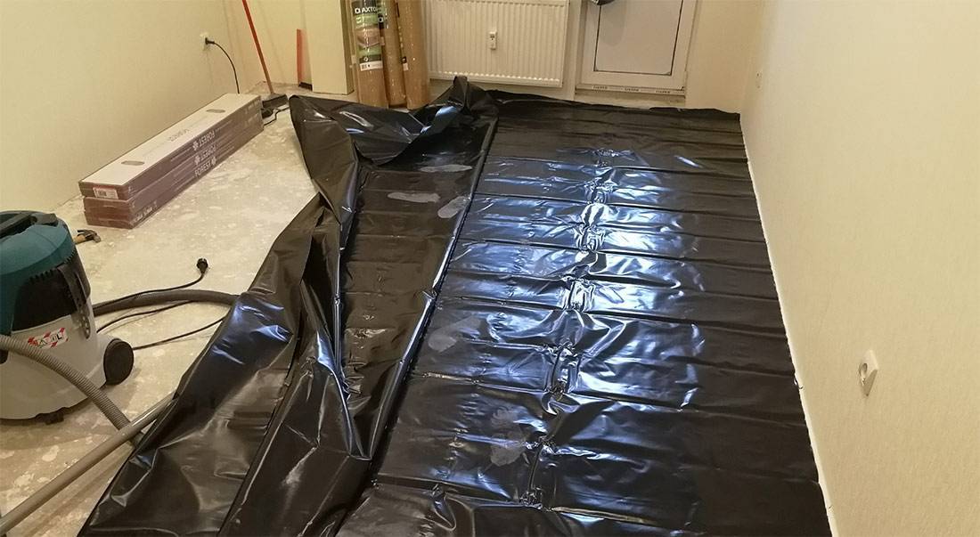 Полиэтилен толщиной в 200 микрон свободно раскладывается с наплывом частей 20 см и скрепляется клейкой лентой. Сайты и производители рекомендуют делать нахлест на стены около 50 мм, затем обрезать.
