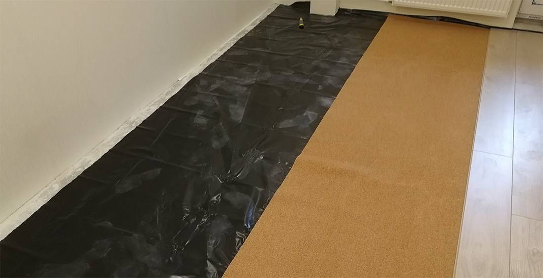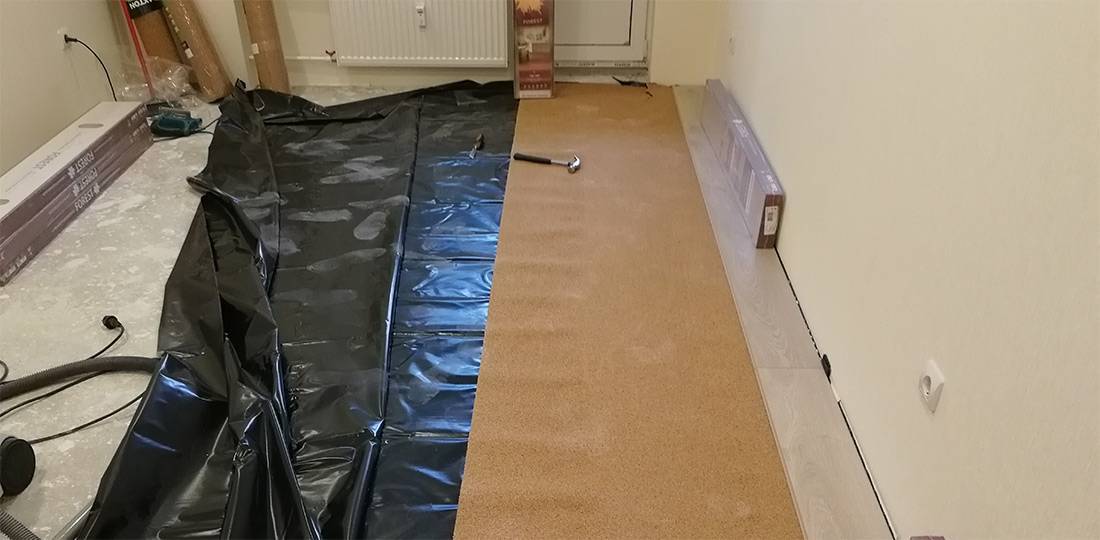В качестве подложки под ламинат используют обычный полиэтилен. Его расстилают на основании с нахлестом полос на 15 см и заводят на стены на высоту 4 см. Все стыки материала проклеиваются скотчем. Сверху на прослойку из полиэтилена укладывают полипропиленовую подложку или техническую пробку. Они нужны для нивелирования незначительных дефектов основания или в качестве дополнительной тепло- и звукоизоляции.