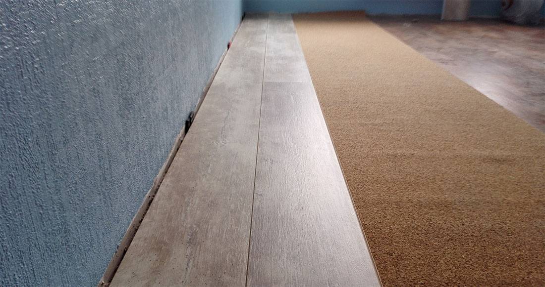 С пола необходимо убрать весь мусор, пыль и грязь. Далее по нему расстилается подложка стык в стык. Соединения отдельных ее фрагментов проклеиваются скотчем или малярной лентой. Некоторые производители предлагают ламинат с уже приклеенной к нему подложкой, что значительно упрощает работу. Но часто приходиться докупать ее самостоятельно. При этом вовсе не обязательно, чтобы подложка и напольное пробковое покрытие были одного производителя.