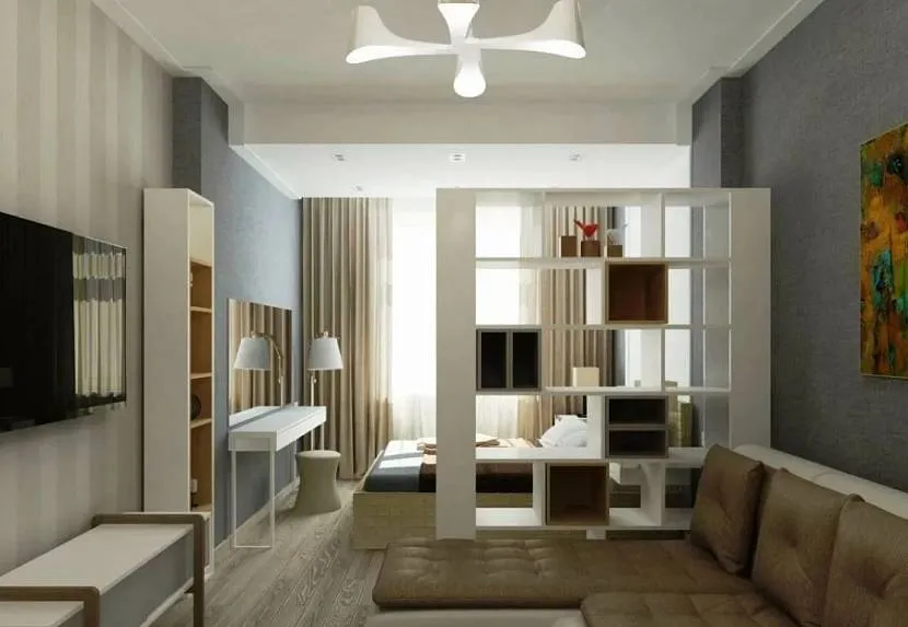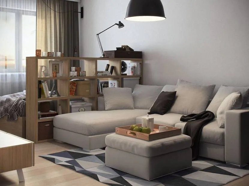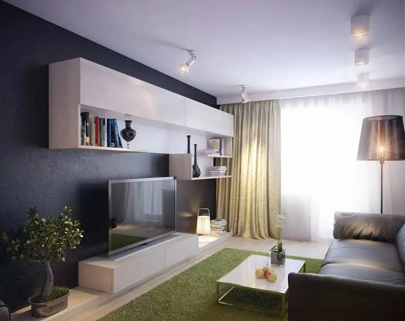 Чтобы отделить зону гостиной применяют шкаф, стеллаж, диван. Телевизор размещают на стене или в шкафу. Если позволяет пространство, можно поставить ещё кресло с кофейным столиком.