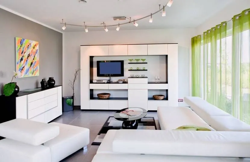 Хай тек сочетает в себе современные тенденции и минимализм. Этот стиль хорошо подойдёт для гостиных, чей размер не превышает 15 кв. метров. Мебель используется встроенная, лишние элементы декора отсутствуют. Самые популярные цвета: чёрный и белый, иногда в сочетании с красным или зелёным. Поверхности стеклянные или металлические.