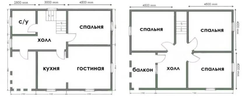 Второй этаж – спальная зона, первый этаж – комнаты общего пользования. План дома также должен учитывать прямой доступ в комнаты, то есть смежных помещений в нем быть не должно. Готовая планировка дома 8х10 поможет предусмотреть фундамент не только под несущие, но и под разделительные стены.