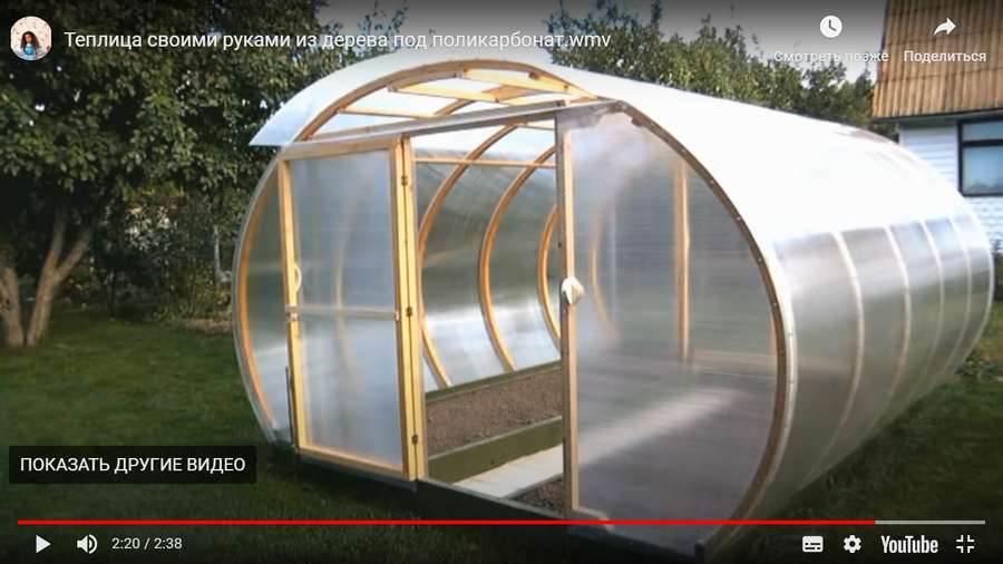 Теплица вроде этой представляет собой сегмент круга и достаточно экономична, опять же, она может быть установлена к стене любого строения, чтобы была экономия места, материла, энергии на обогрев. Брус – в качестве каркаса и пленка, которой затянут каркас.