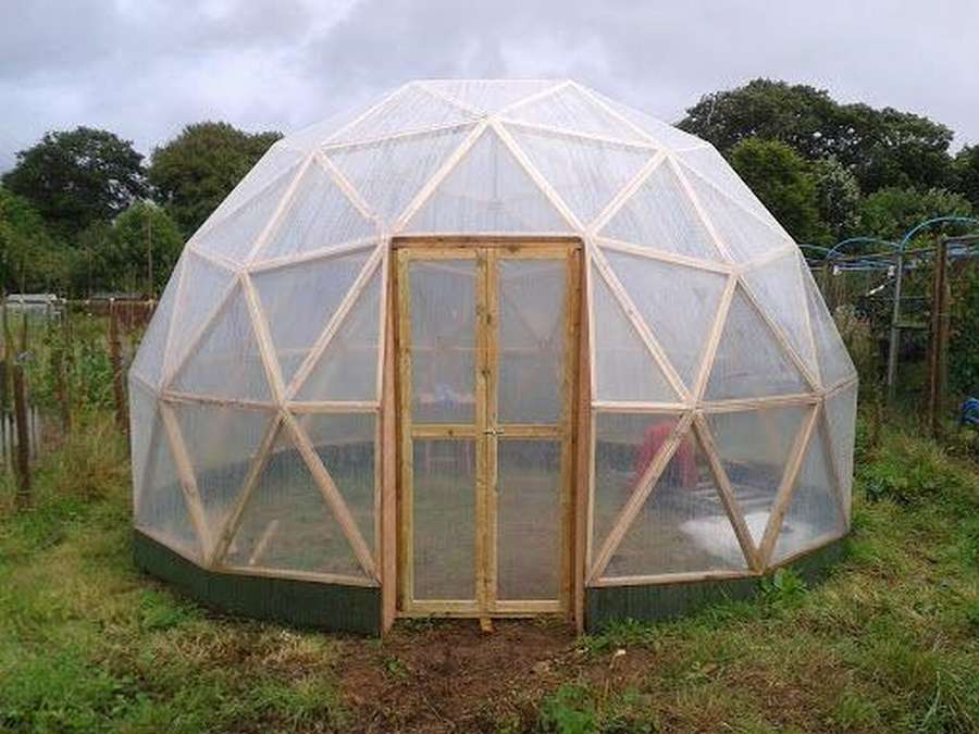Необычная конструкция следующего вида теплицы предполагает немного затянувшуюся сборку ее, но если у вас брус небольшой длины, а времени немало, то этот вариант ваш. Ведь преимуществ здесь масса – устойчивость, долговечность, большая площадь для обогрева и освещения солнцем и так далее. Собираем треугольники, треугольники в шестигранники и шестигранники в купол. Сверху пленка и отличная теплица готова.
