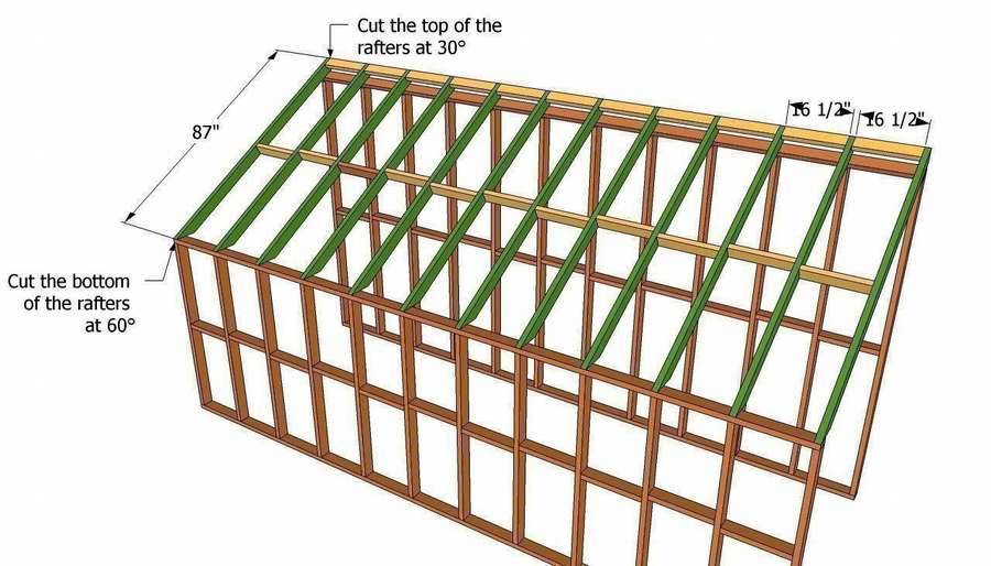 Выполняют их крепление (можно выполнить винтовое соединение или применить сварку). После приступают к монтажу стропил. Их наклон может быть произвольным, но не менее 30 градусов. Длина стропил должны быть такой, чтобы они выходили за внешний край каркаса до 25 см. Также на данном этапе необходимо продумать наличие форточки, чтобы создать естественную вентиляцию внутри пристенного парника