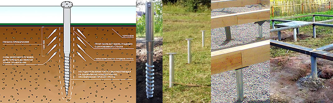 Гладкий оголовок геошурупов для плотных грунтов равномерно-цилиндрический. Те и другие геошурупы возможно применять на грунтах вплоть до чрезмернопучинистых. На головки геошурупов можно как укладывать деревянную нижнюю обвязку строения, так и монтировать стальной ростверк. О том, как строится деревянный дом на винтовых сваях, см., напр. след. видео: