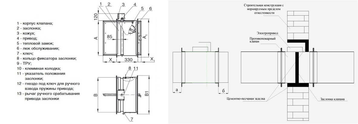 Конструкция клапанов обеспечивает возможность присоединения клапана как к каналу воздуховода, так и стеновой проем. Конструкция клапанов состоит из корпуса, выполненного из нержавеющей стали марки 12Х18Н10Т, установленной в нем заслонки створчатого (поворотного) типа с огнестойким материалом и привода.