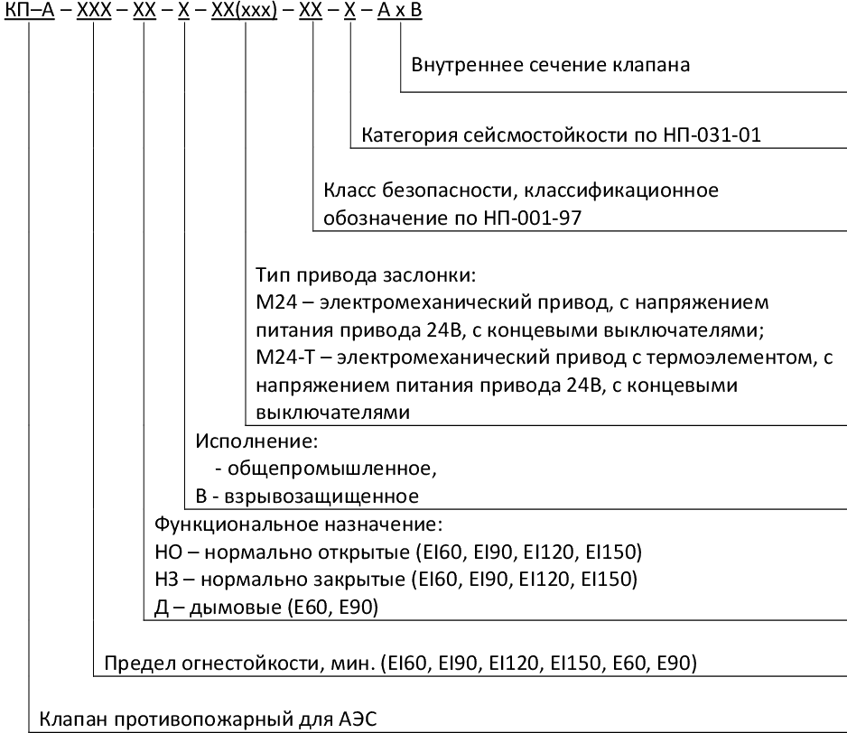 Пример условного обозначения при заказе и в другой документации:«Клапан противопожарный КП–А-EI120-НО-М24-4-II-400×400 ГТКМ.632752.002ТЗ»Клапан противопожарный с пределом огнестойкости 120 мин, нормально открытый, с электромеханическим приводом на 24В, 4 класса безопасности, II категории сейсмостойкости, сечением 400×400 мм.