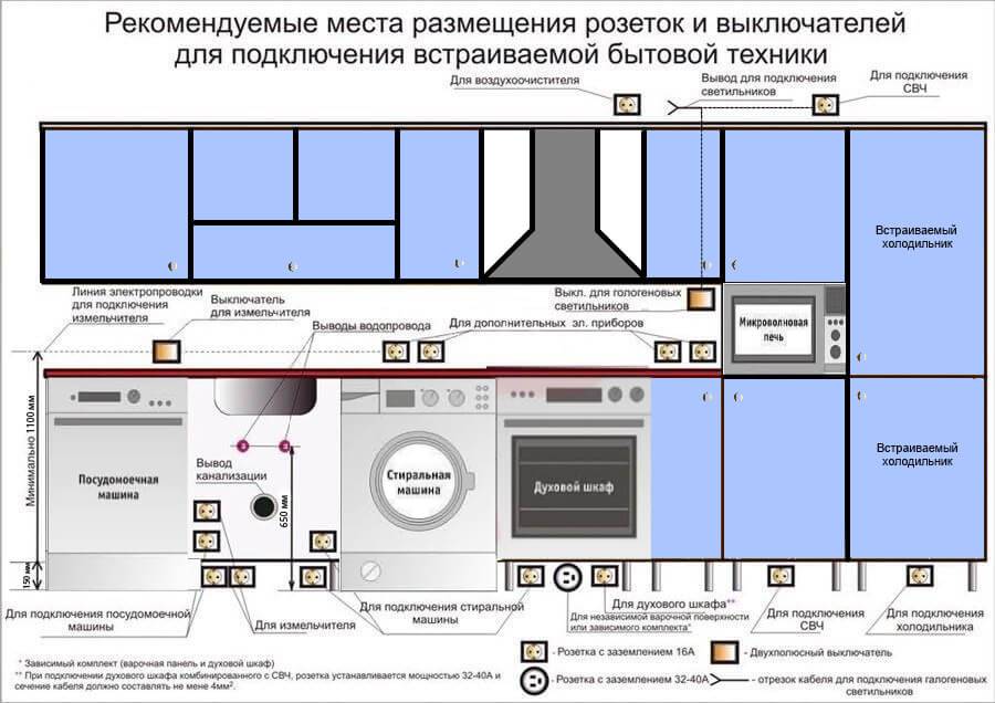 Составляя схему расположения розеток и выключателей, обязательно надо учесть места установки мебели и электроприборов. Ряд правил поможет создать удобство и безопасность на кухне: