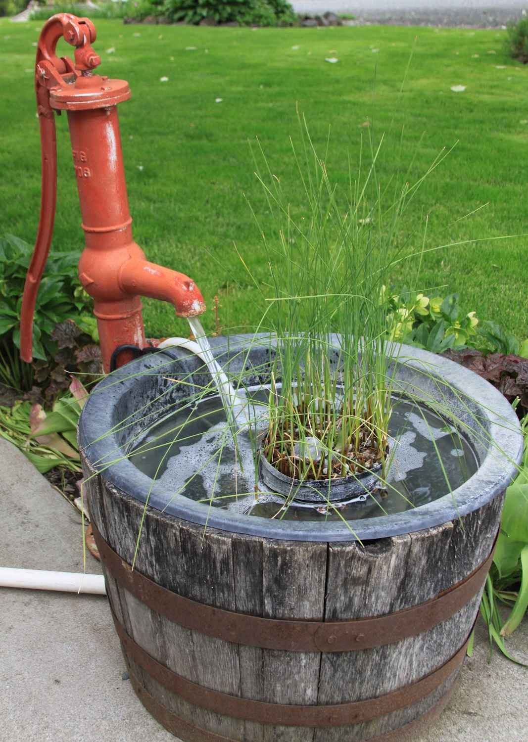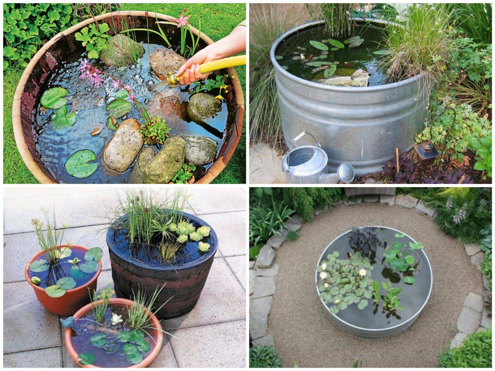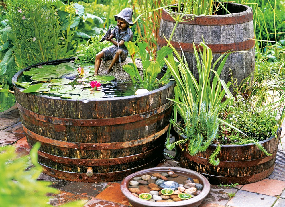 Возьмите старую металлическую или деревянную тазу, небольшую бочку или кадку. Каждый может стать оригинальным декоративным резервуаром, который даже не нужно погружать ниже уровня земли.