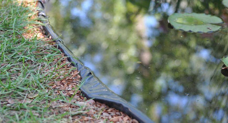 - Укрепляют берега. Уклон зависит от типа почвы – на песчаных грунтах уклон в сторону от центра пруда составляет до 55 градусов, а для глинистых грунтов делают вертикальные берега. Для укрепления берут полимерную георешетку, геоматы, сетку рабицу. Фиксируют на колышки или заворачивают концы на поверхность грунта, затем оформляют декором.