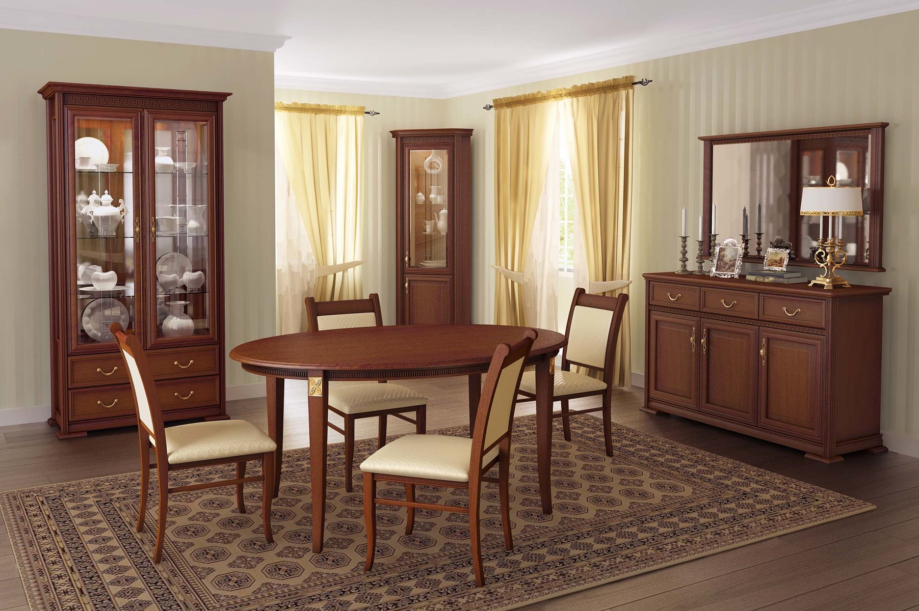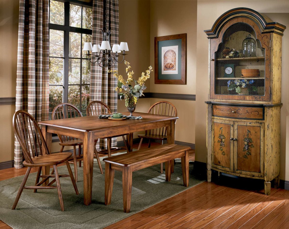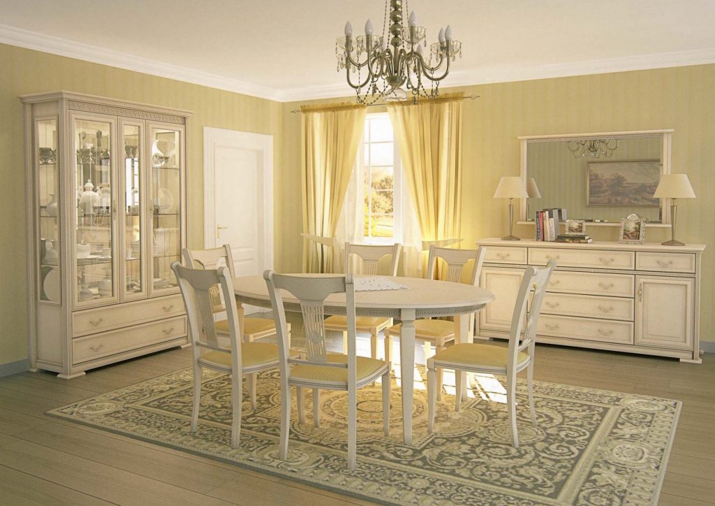 В первую очередь расстановка определяется размерами мебели. Нужно учитывать не только сами габариты, но и количество пространства для прохода между предметами, а также для взаимодействия с ними (открывания дверок буфета, отодвигания стульев). Например, чтобы свободно сидеть за столом, потребуется площадь размером примерно 80 х 80 см. Может быть несколько вариантов расстановки в зависимости от особенностей пространства: