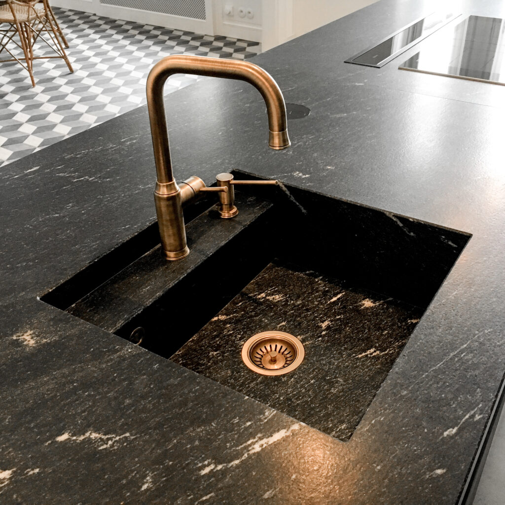 Выбирая кухонную мойку из камня, стоит также обратить особое внимание на её форму и цвет. Если второй критерий повлияет исключительно на красоту и стилистическую выдержанность интерьера, то первый может сыграть решающую роль в создании комфорта и уюта. Гораздо удобнее будет мыть посуду и продукты в глубокой мойке с высоким смесителем, поэтому лучше всего подбирать глубокие чаши