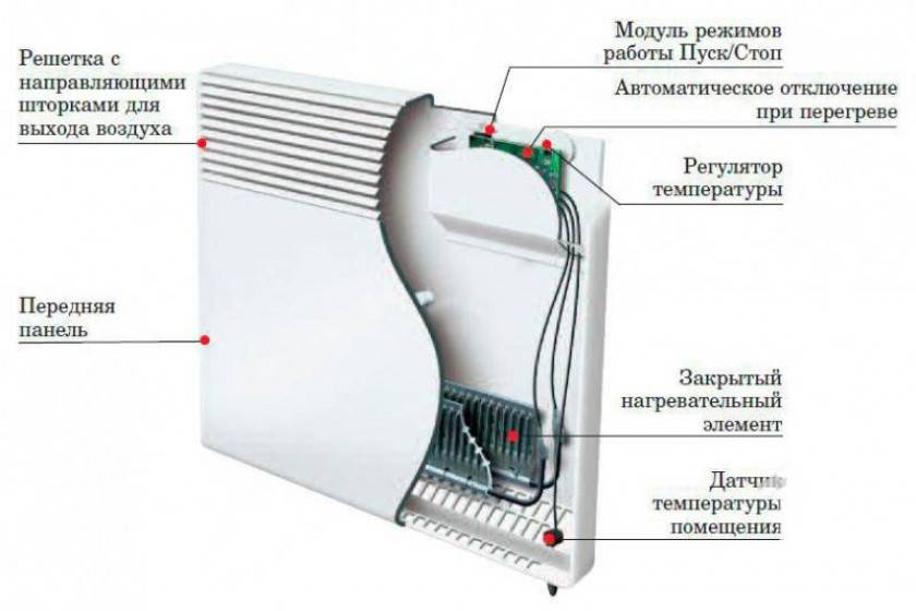 Конвекторы внешне похожи на панельные стальные радиаторы, имеют небольшую толщину и габариты, различную мощность. Их можно повесить на стену или установить на пол, обычно модели укомплектованы ножками и кронштейнами для крепления к вертикальной плоскости. Большинство современных конвекторов оснащены системой автоматического регулирования температуры, а иногда и таймером. Они бесшумны, безопасны, быстро нагревают помещение.