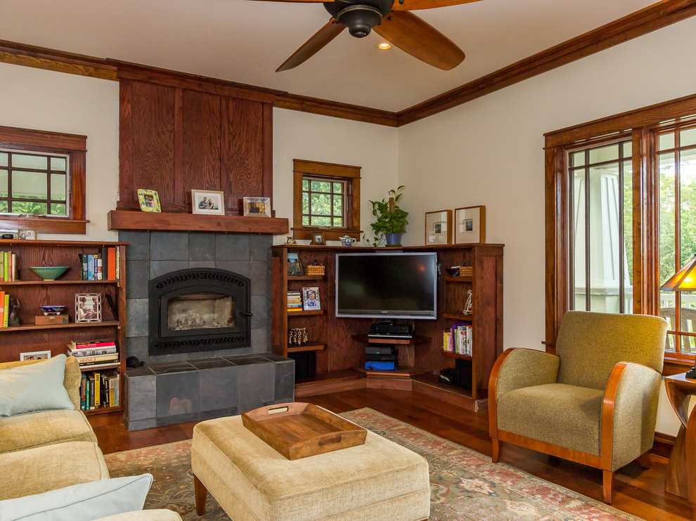 Если в гостиной есть скошенный угол, его выделяют камином и телевизором, а сидячие места ставят напротив.