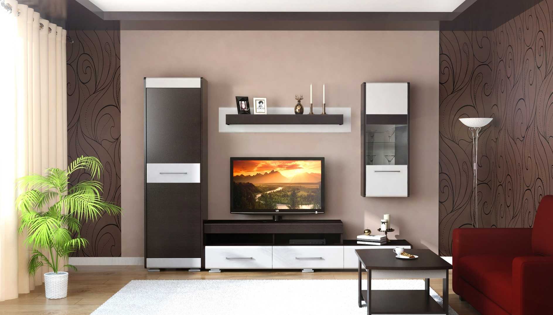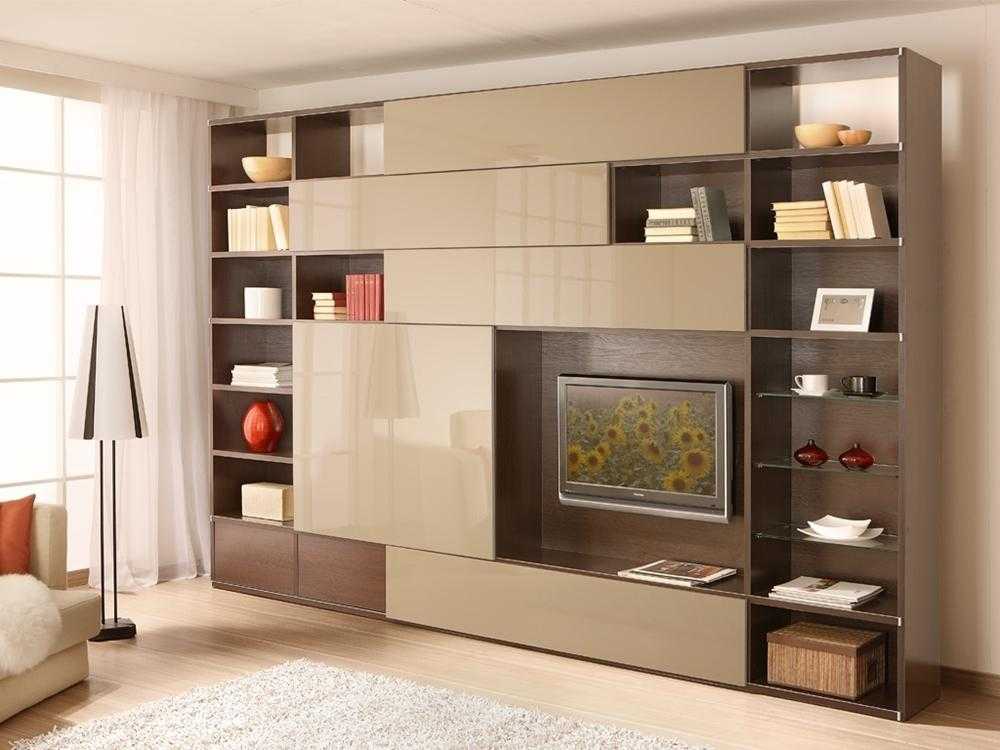 Прежде всего нужно продумать, что будет там храниться, чтобы выбрать подходящую модель мебели. Например, в ней могут находиться сервант под посуду, книжные полки или гардероб. От веса, который предстоит выдерживать стенке, зависят ее конструкция и материал изготовления. Если он не слишком велик, это может быть подвесной шкафчик, визуально расширяющий комнату. Для больших залов хороша угловая горка или несколько конструкций, придвинутых к смежным стенам. Им лучше не стоять вплотную друг к другу, тогда будет больше воздуха.