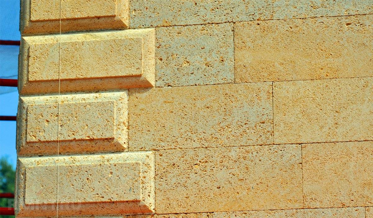 Известняк в блоках удерживает тепло в доме. Из недостатков можно выделить хрупкость, склонность к выветриванию и образованию желтых разводов при соприкосновении с металлом.