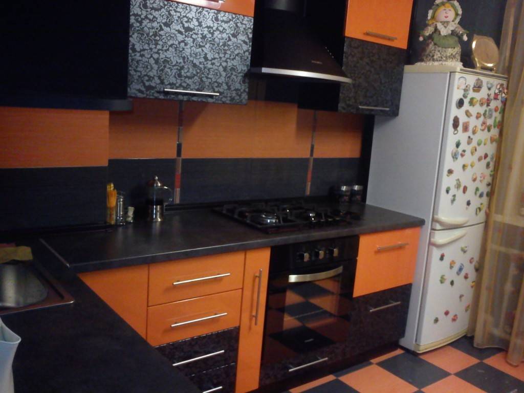 Например, фон кухни формируется из двух цветов: белого и черного, матового и глянцевого. В данном случае, к белому матовому гарнитуру подбирается черный глянцевый фартук. При этом выполняется в белом цвете потолок, а стены и пол выполняются в темном цвете.