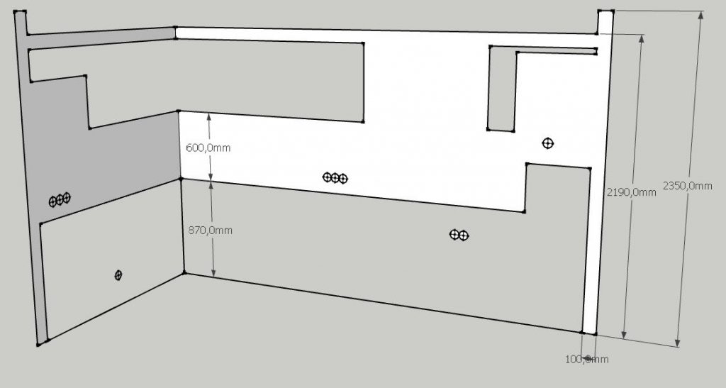 Для линейного углового шкафа с примыканием соседнего модуля под прямым углом обычно используют размер 650х300(320) или 750х300(320) от угла. Высота при этом может быть также 720, 900 при стандартной размерной сетке фасадов.