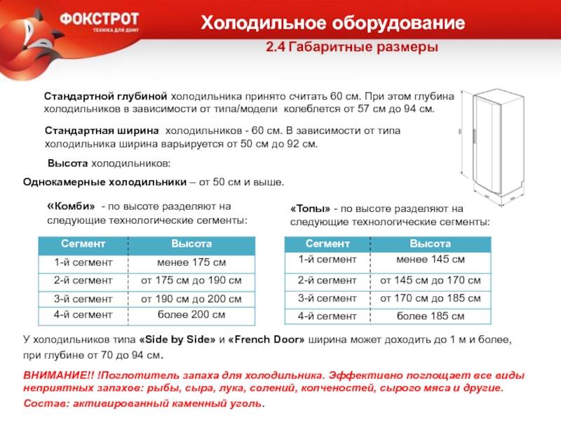 Чтобы потребителю проще было определиться во всём разнообразии, габариты более распространённых холодильников были стереотипизированы по трём обмериваниям, а ещё по общему объёму. Для Европы и Азии такие стандарты смогут выделяться, поскольку отличается структура: