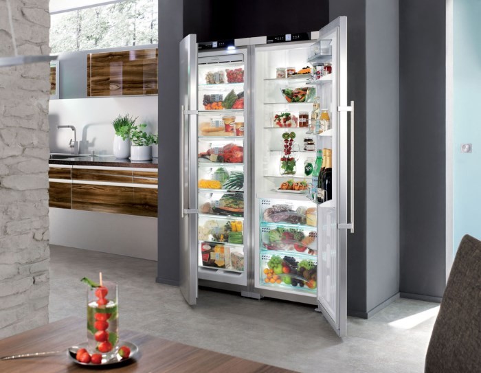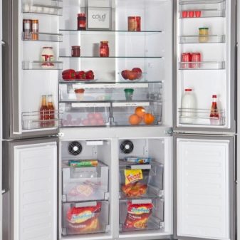 Внушительных размеров устройства относятся к категории Side by Side. У них 2 камеры, находящиеся рядом. Морозильная слева, а холодильная справа. Естественно, такие устройства приобретают для больших помещений, в малогабаритную кухню хрущёвке такое устройство просто не вместится. Объёмы данной техники допускает содержать много свежих и грамотно замороженных продуктов.