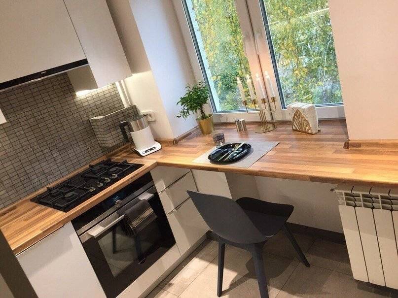 Чаще всего, когда кухня маленькая и важен каждый метр для задействования его в функциональном плане, у окна обустраивают столешницу. Чтобы такой прием смотрелся гармонично, необходимо подоконник сделать продолжением уже имеющегося стола