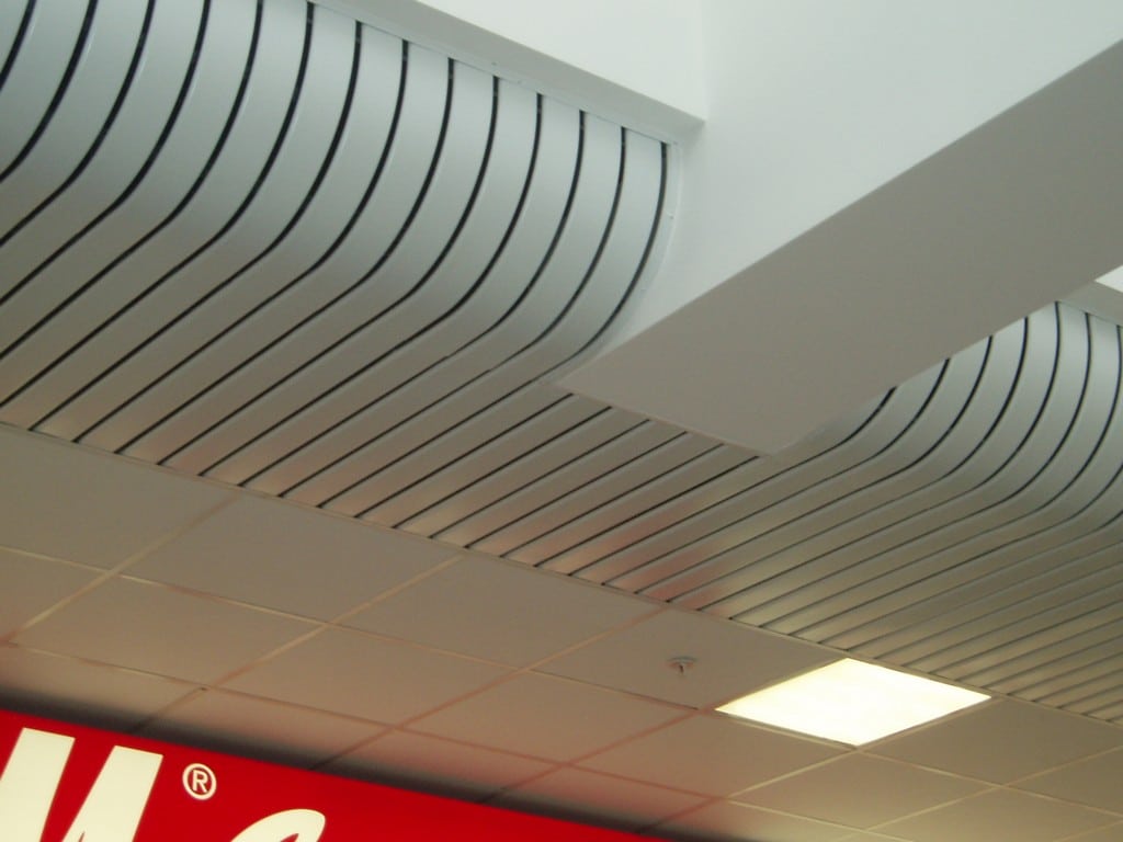 - Он представляет собой подвесную конструкцию, собранную из алюминиевых реек, которые покрыты декоративным лаком.