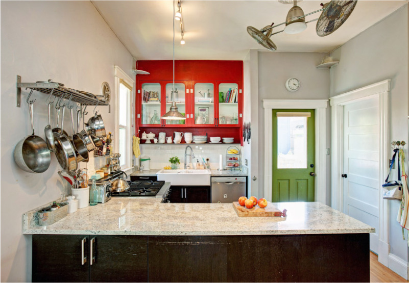 При отсутствии навесных шкафов на кухне рационализируйте свободное пространство: расположите не нем два уровня рейлингов и наслаждайтесь их функциональностью.