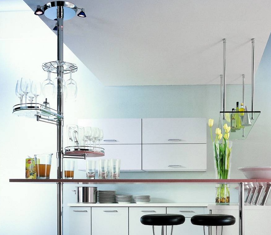 Подвесные рейлинговые системы крепятся к потолку. Конструкция изделий очень схожа с решеткой, на которой располагается множество держателей для кухонной утвари, в том числе бокалов, чашек и другой посуды. Это неотъемлемый элемент для кухни с барной стойкой или островом. Такой вариант расположения придает кухне дополнительный уют.