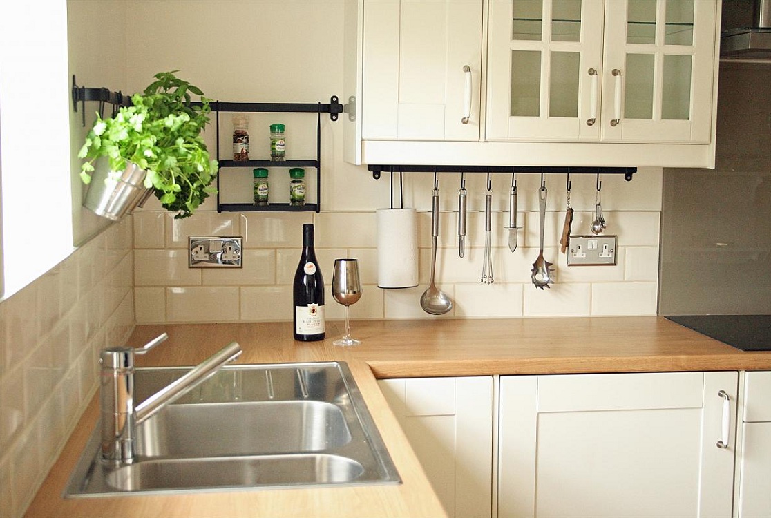Не ограничивайтесь использованием рейлинговой системы только в качестве хранения баночек со специями: расположите на одной из полке декоративный элемент – цветочный горшок с искусственной травой: он освежит вашу кухню.