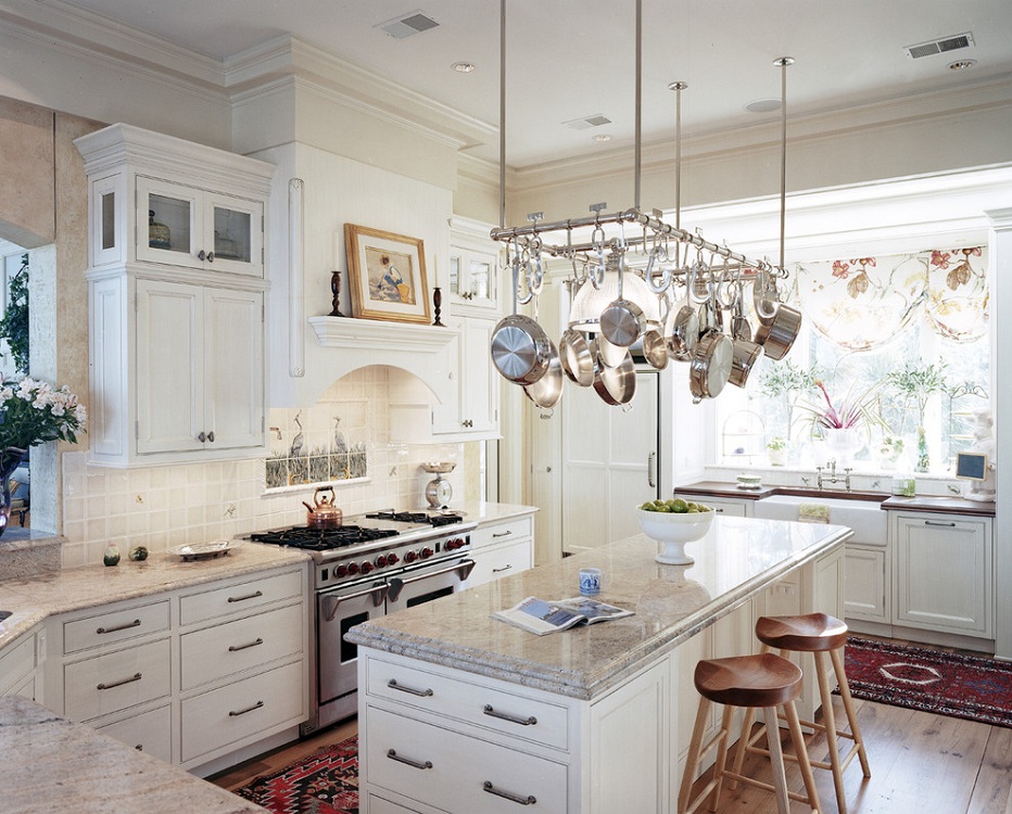 В интерьере классической кухни не обойдется без навесной системы рейлингов бронзового или золотого оттенка: подберите подходящий цвет конструкции согласно тону остальной фурнитуры: ручек навесного шкафа и нижних ящиков.
