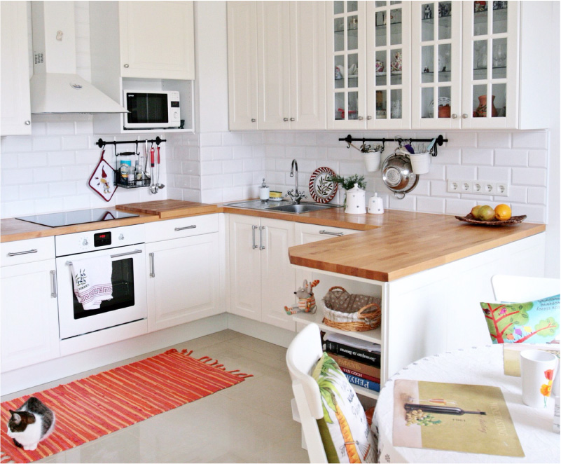 Форма полочек бывает самой разнообразной: от квадратных до округлых, прямоугольных и угловых, их удобно разместить рядом с варочной поверхностью или мойкой. Около раковины в них размещают столовые приборы, а возле плиты — лопаточки, которыми перемешивают еду во время готовки.