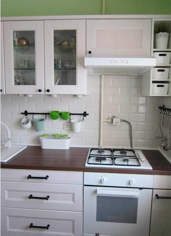 Чтобы сэкономить место на маленькой кухне, можно выбрать подвесную вытяжку рециркуляционного типа. Она не отводит воздух, а очищает с помощью фильтров. Такая вытяжка компактная и позволяет сохранить место для еще одного шкафчика.