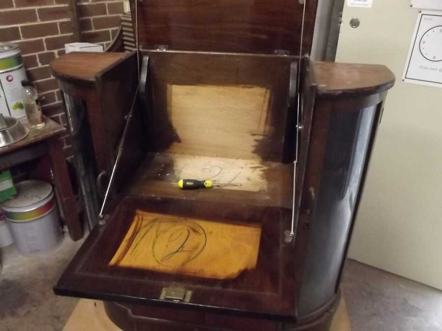 Работы по реставрации такой антикварной мебели своими руками начинаются с тщательной обработки всех поверхностей тумбы шлифовальной машиной. В тех местах, где машина не проходит, используйте наждачную бумагу. Трещины выравниваются с помощью шпатлевки.