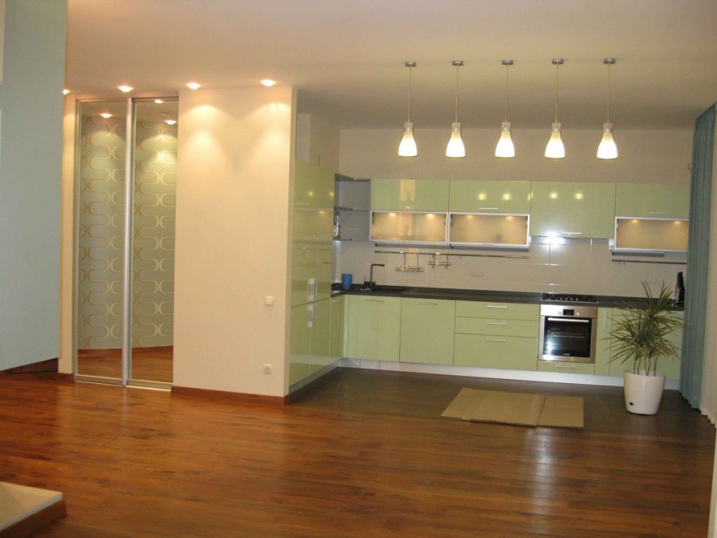 Например, берем столешницу со стеклянным покрытием или застекляем парадный фасад кухни и увеличиваем зрительно область помещения.
