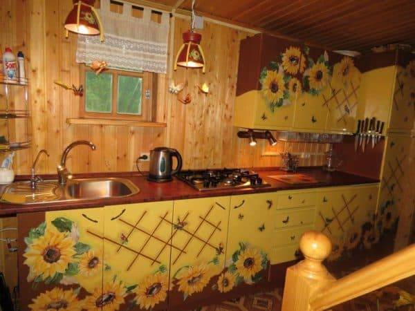 То же относится и к остальным мебельным элементам – двери для кухни из массива можно украсить различным навесным декором – молдингами пластиковыми, деревянными, гипсовой лепниной. В продаже имеется масса вариаций этой фурнитуры, различающихся как по форме, размерам, так и по виду декоративной отделки, окраски. Можно применить и другие вариации украшений элементов мебельных конструкций, например, декорировать ножки столов и стульев цветными нитками, разного рода резьбой, выжиганием, после чего покрыть их лаком.