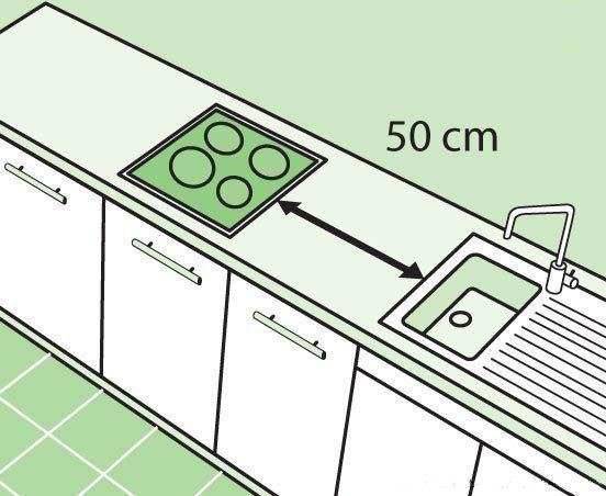 Чтобы избежать шишек на лбу от ударов об верхние шкафчики, следует отступить от уровня столешницы минимум 500-700 мм.