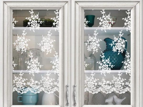 Старую тюль можно использовать для декорирования кухонных шкафчиков в стиле шебби шик