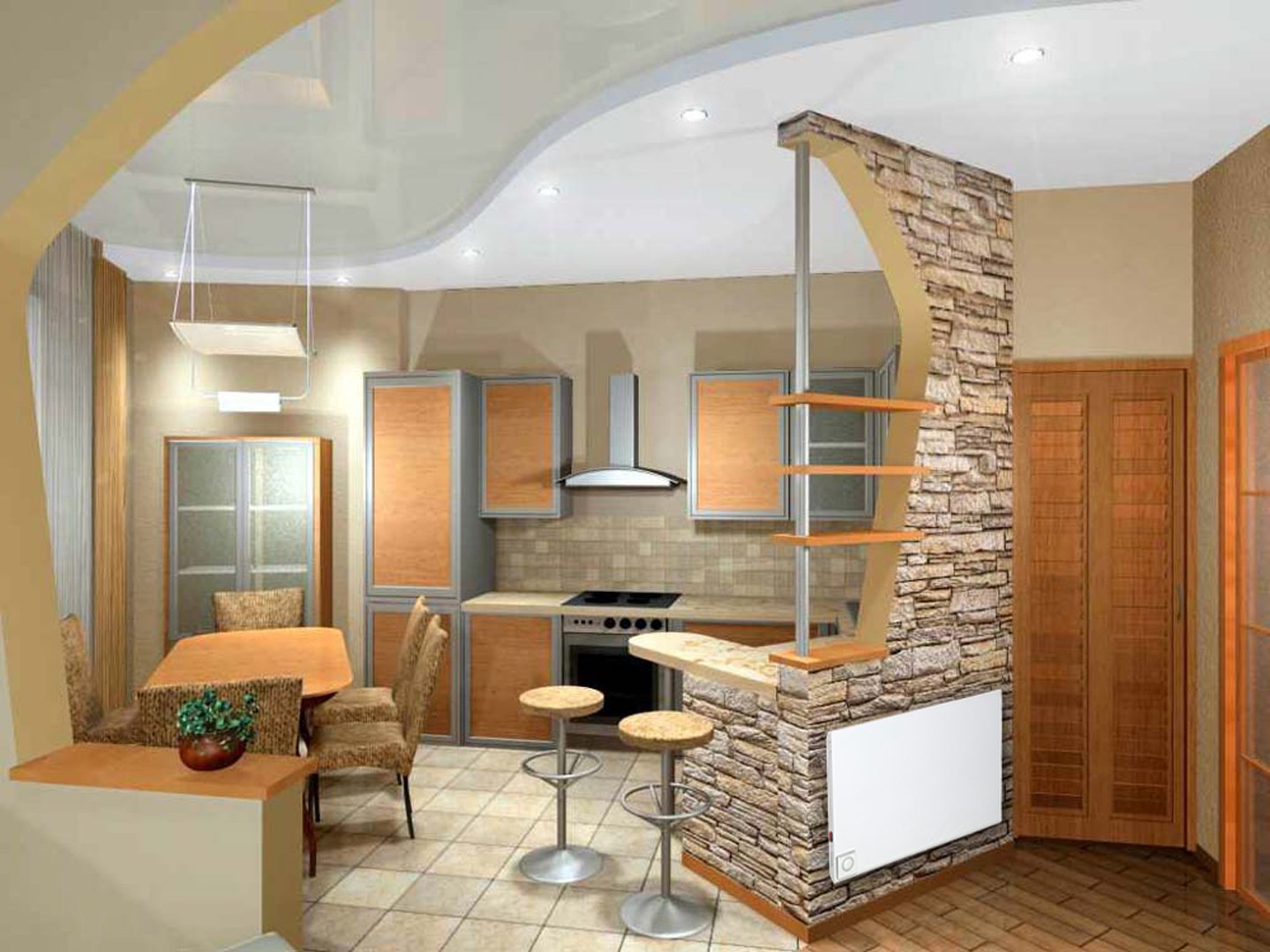 Учтите, что в маленькой кухне лучше не применять массивные сооружения, они забирают часть пространства. Фото ниже продемонстрируют различные варианты отделки потолка помещения для приготовления пищи.