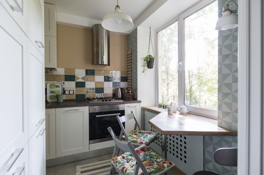 В кухнях такой техники достаточно – это миксер, мультиварка, хлебопечь, мясорубка, чайник, кофеварка, причем 3-4 предметы из списка нужны постоянно. Обычно их размещают на свободных от готовки модулях, а для остальных предметов найдите место в шкафу. Кстати, вы можете увеличивать рабочую зону кухни благодаря подоконнику. Его можно удлинить на ширину столешницы и соединить их. Чтобы подоконник получился устойчивым, под ним можно сделать фальшстенку на 5-10 см и разместить внутри радиатор отопления. Таким образом, будет увеличена зона готовка, вид из окна будет поднимать настроение. Есть и недостатки, а именно то, что будет нарушена конвекция, если батарея будет размещена под окном, кроме того, вам будет неудобно открывать окно.