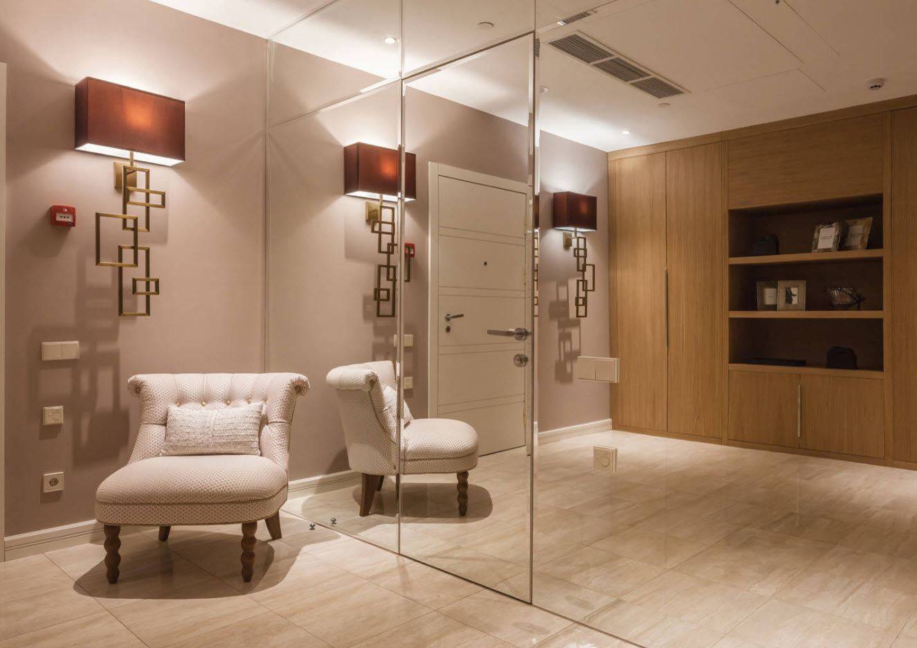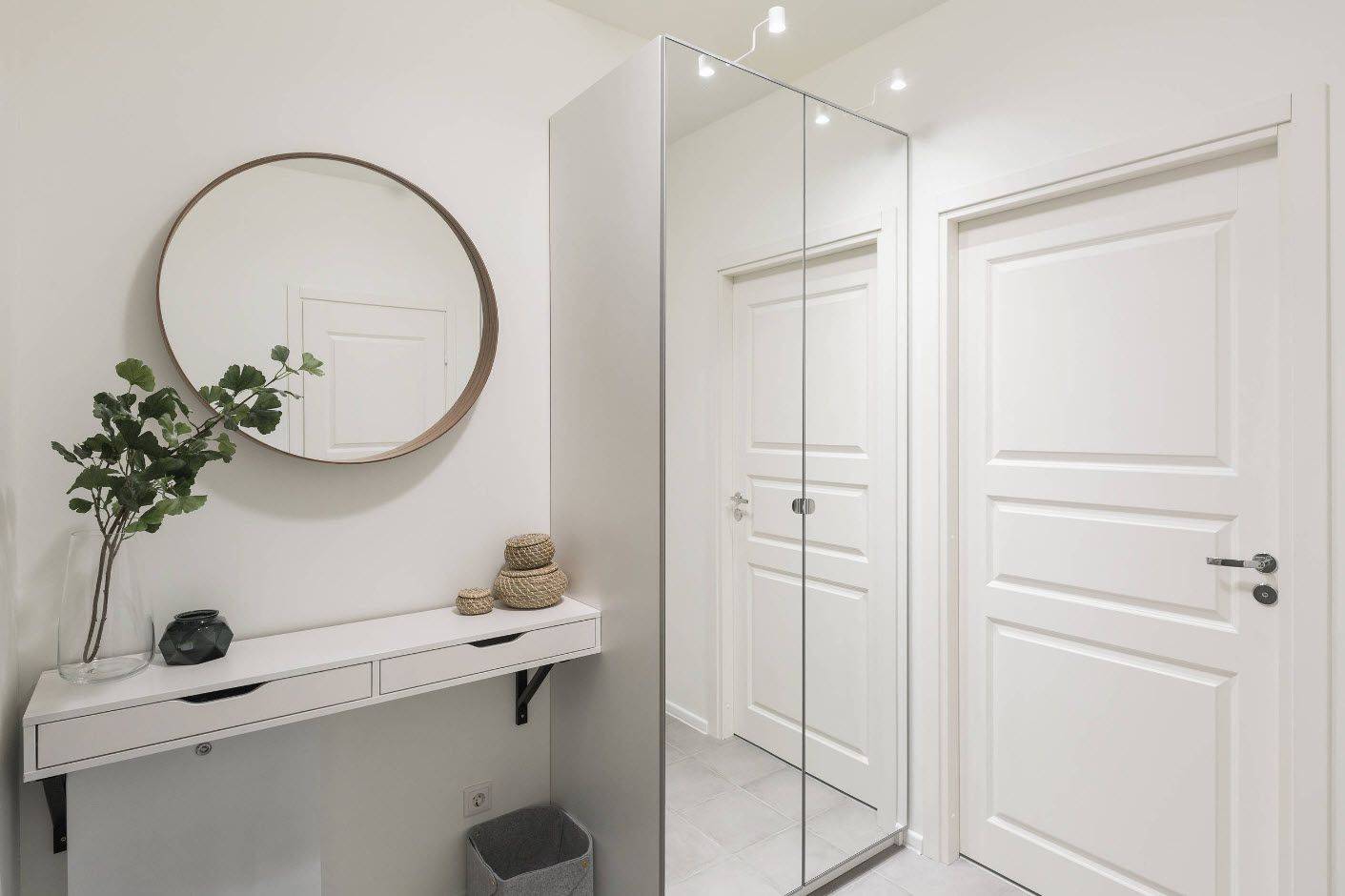 Если планировка прихожей позволяет разместить зеркальный шкаф-купе прямо напротив входной двери, обязательно используйте такую возможность.